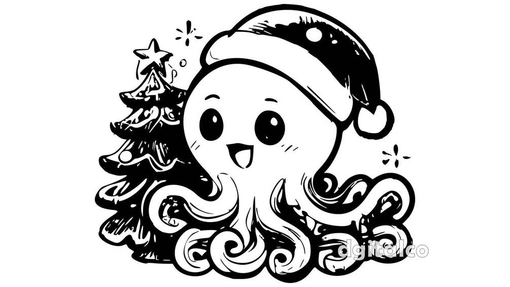 One-of-a-kind, charming illustration of a joyful baby octopus embracing a Christmas tree