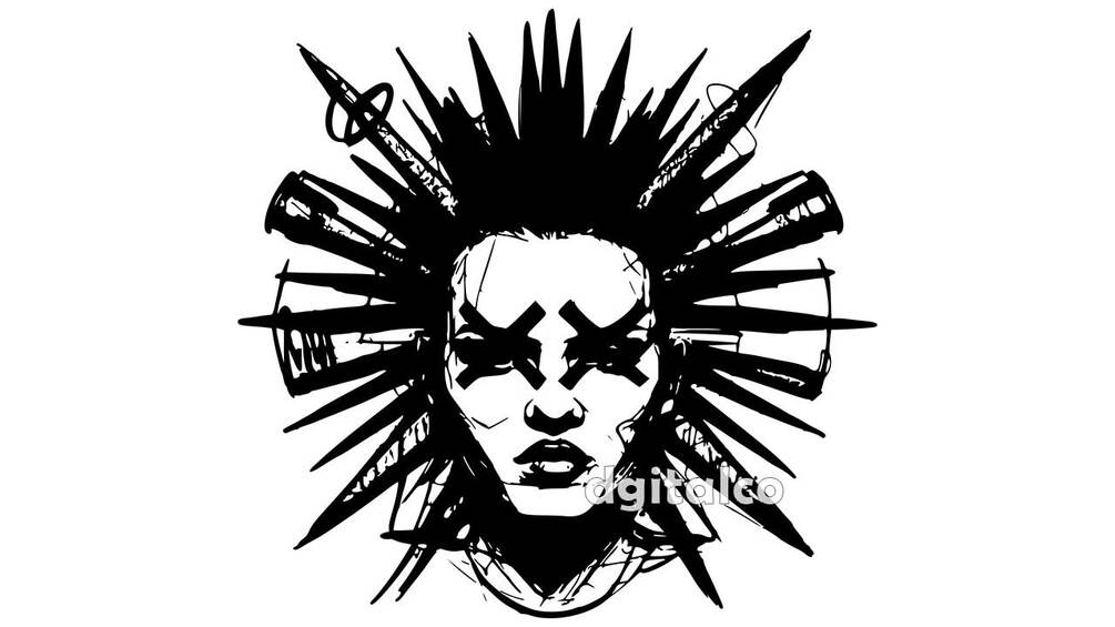 Capture the rebellious spirit of punk rock with this bold vector illustration of a woman's face drawn in ink, maintaining the charm of the original artwork even in vector format. Her eyes blindfolded by two crosses and her disheveled hair exude an aura of mystery and rebellion.